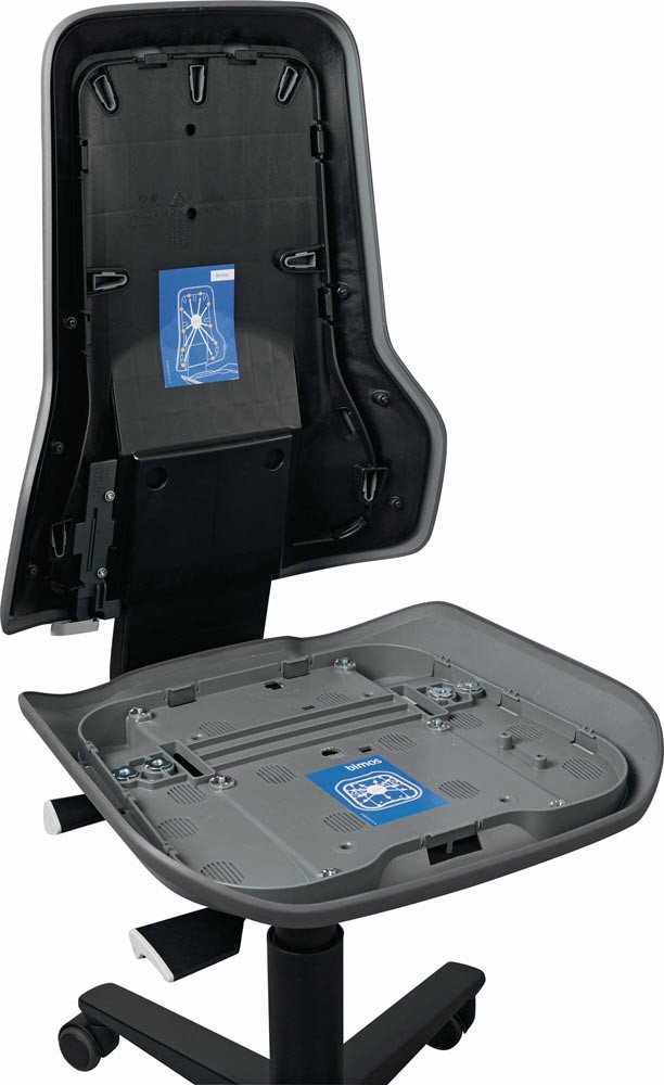 nach DIN 68877 · bedienungsfreundliche Gasfeder-Sitzhöhenverstellung · ergonomisch geformte Sitzfläche und Rückenlehne mit Wechselpolstersystem (Zubehör) · Permanentkontakt-Rückenlehne · Sitz in Neigung, Höhe und Tiefe verstellbar · höhenverstellbare Rückenlehne · Untergestell mit stabilem Aluminium-Fußkreuz und lastabhängig gebremsten Sicherheits-Doppelrollen für harte Böden · Stuhl kann nur in Vebindung mit einem Wechselpolster eingesetzt werden