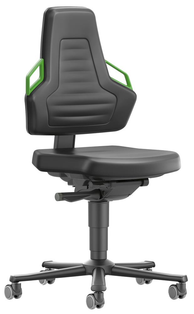 Arbeitsdrehstuhl mit autom. Gewichtregulierung, Sitz Kunstleder schwarz, Griffe grün, Rollen, Sitz Höhe 450-600 mm E6042558