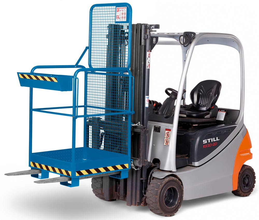· TÜV geprüfte Sicherheit, entsprechend der DGUV (Deutsche gesetzliche Unfallversicherung) · Stabile Stahlkonstruktion mit rundum Absturzsicherung aus Rohr gemäß UVV · Arbeitskörbe mit TÜV-Zulassung für 2 Personen · Arbeitsplattform aus rutschsicherer Tränenblechkonstruktion mit Abrollschutz · Steckbolzensicherung verhindert das Abrutschen von den Gabelzinken · Pulverbeschichtet · Verzinkte Ausführung auf Anfrage lieferbar ∙ Klappbar auf der Seite der Einfahrtaschen
