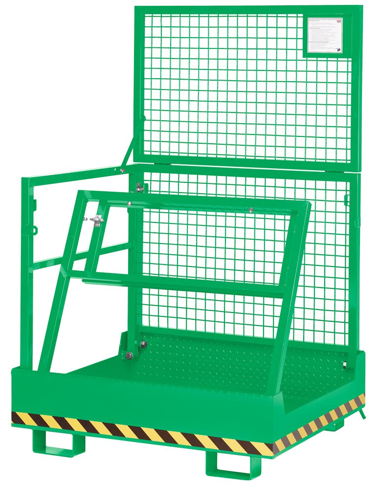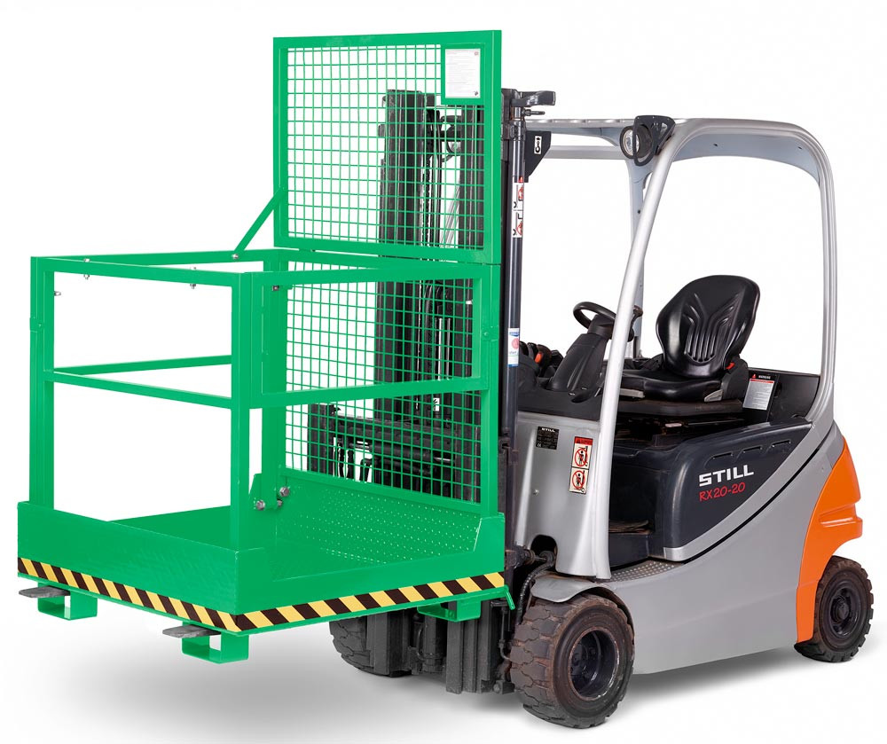 · TÜV geprüfte Sicherheit, entsprechend der DGUV (Deutsche gesetzliche Unfallversicherung) · Stabile Stahlkonstruktion mit rundum Absturzsicherung aus Rohr gemäß UVV · Arbeitskörbe mit TÜV-Zulassung für 2 Personen · Arbeitsplattform aus rutschsicherer Tränenblechkonstruktion mit Abrollschutz · Steckbolzensicherung verhindert das Abrutschen von den Gabelzinken · Pulverbeschichtet · Verzinkte Ausführung auf Anfrage lieferbar ∙ Klappbar auf der Seite der Einfahrtaschen