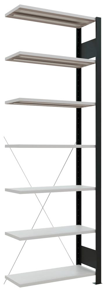· Ständerrahmen mit Tiefenriegeln, pulverbeschichtet in schwarz · Rahmenfronten ungelocht zur attraktiven Optik · Aussteifung durch Kreuzstrebe · Stahlfachböden mit 25 mm hoher Kante, höhenverstellbar im 25-mm-Raster, RAL 7035 lichtgrau · Ohne Anschlagleiste ∙ Zur einseitigen Regalbestückung