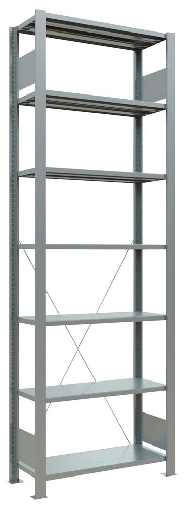 · Ständerrahmen mit Tiefenriegeln, pulverbeschichtet in RAL 7035 lichtgrau · Rahmenfronten ungelocht zur attraktiven Optik · Aussteifung durch Kreuzstrebe · Stahlfachböden mit 25 mm hoher Kante, höhenverstellbar im 25-mm-Raster, RAL 7035 lichtgrau · Ohne Anschlagleiste ∙ Zur einseitigen Regalbestückung