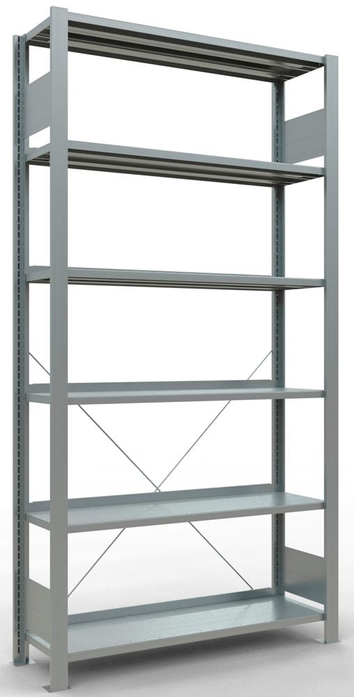 · Ständerrahmen mit Tiefenriegeln, verzinkt · Rahmenfronten ungelocht zur attraktiven Optik · Aussteifung durch Kreuzstrebe · Verzinkte Stahlfachböden mit 25 mm hoher Kante, höhenverstellbar im 25-mm-Raster · Mit Anschlagleiste (der Deckboden hat keine Anschlagleiste) ∙ Zur einseitigen Regalbestückung