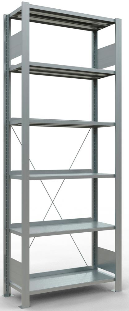 · Ständerrahmen mit Tiefenriegeln, verzinkt · Rahmenfronten ungelocht zur attraktiven Optik · Aussteifung durch Kreuzstrebe · Verzinkte Stahlfachböden mit 25 mm hoher Kante, höhenverstellbar im 25-mm-Raster · Mit Anschlagleiste (der Deckboden hat keine Anschlagleiste) ∙ Zur einseitigen Regalbestückung