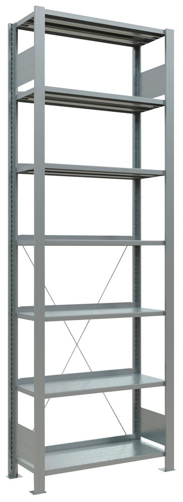 · Ständerrahmen mit Tiefenriegeln, verzinkt · Rahmenfronten ungelocht zur attraktiven Optik · Aussteifung durch Kreuzstrebe · Verzinkte Stahlfachböden mit 25 mm hoher Kante, höhenverstellbar im 25-mm-Raster · Mit Anschlagleiste (der Deckboden hat keine Anschlagleiste) ∙ Zur einseitigen Regalbestückung