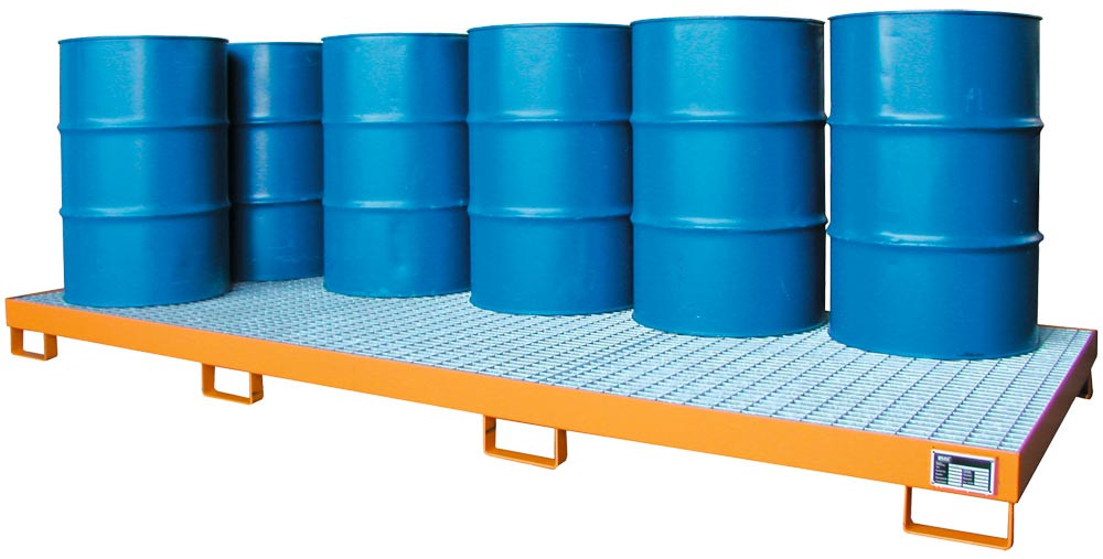 Auffangwanne aus 3 mm Stahlblech, RAL 2000, für 10 Stück 200-l-Fass, stehende Lagerung, 240 l, BxTxH 3250x1300x195 mm, mit Gitterrost verz.