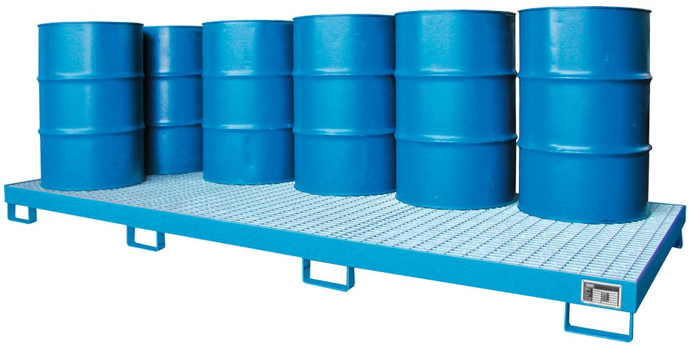 ∙ Aus 3 mm Stahlblech ∙ Mit verzinktem Gitterrost ∙ Stützfüße mit 100 mm Unterfahrhöhe ∙ Wahlweise feuerverzinkt oder mit hochwertiger Lackierung ∙ Zur Lagerung von 200-l-Fässern, auch mit 60-l-Fässern und Kleingebinden kombinierbar