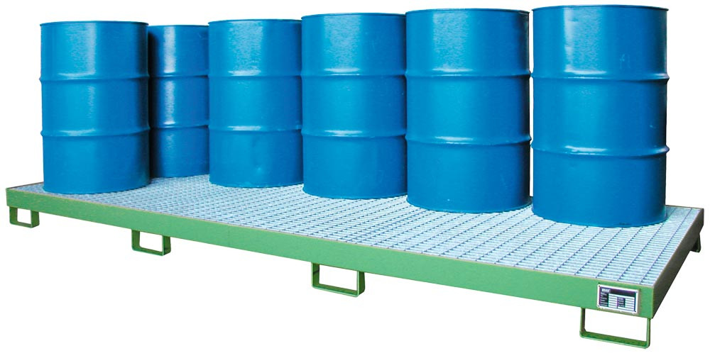 ∙ Aus 3 mm Stahlblech ∙ Mit verzinktem Gitterrost ∙ Stützfüße mit 100 mm Unterfahrhöhe ∙ Wahlweise feuerverzinkt oder mit hochwertiger Lackierung ∙ Zur Lagerung von 200-l-Fässern, auch mit 60-l-Fässern und Kleingebinden kombinierbar