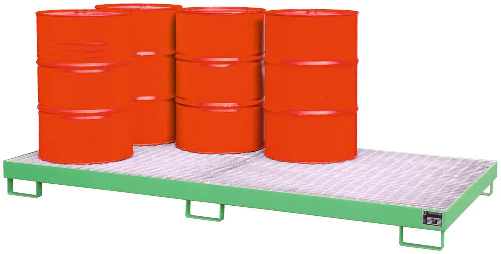 Auffangwanne aus 3 mm Stahlblech, RAL 6011, für 8 Stück 200-l-Fass, stehende Lagerung, 240 l, BxTxH 2650x1300x210 mm, mit Gitterrost verz.