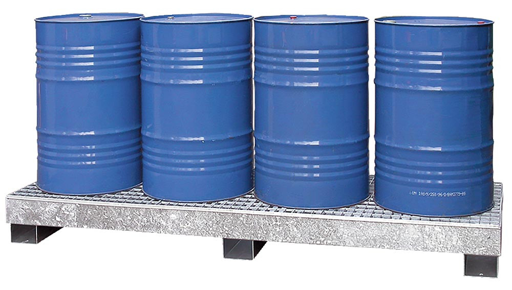 Auffangwanne aus 3 mm Stahlblech, feuerverzinkt, für 4 Stück 200-l-Fässer, stehende Lagerung, Wannenvolumen Auffangvol. 210 l, BxTxH 2400x820x240 mm