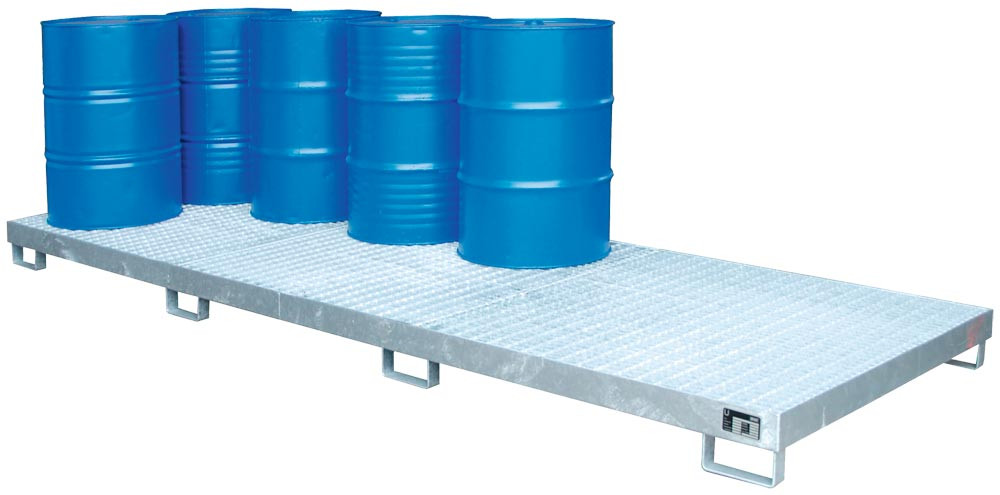 Auffangwanne aus 3 mm Stahlblech, verzinkt, für 12 Stück 200-l-Fass, stehende Lagerung, 333 l, BxTxH 3850x1300x200 mm, mit Gitterrost verz.