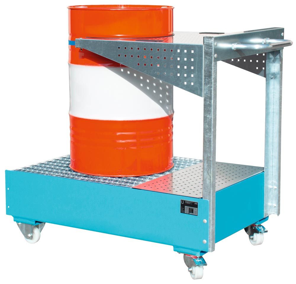 Auffangwanne mit Lochplatte, 3 mm Stahlblech, RAL 5012, fahrbar, für 1 St. 200-l-Fass, stehend Lagern, BxTxH 1450x800x1195 mm, Auffangvol. 215 l