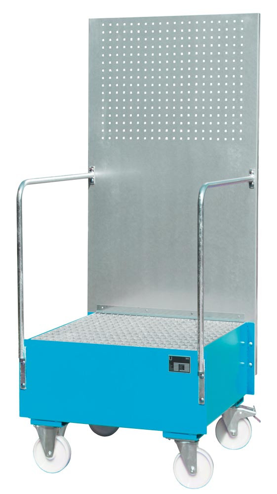 Auffangwanne mit Lochplatte, 3 mm Stahlblech, RAL 5012, fahrbar, für 1 St. 200-l-Fass, stehend Lagern, BxTxH 870x890x2110 mm, Auffangvol. 203 l