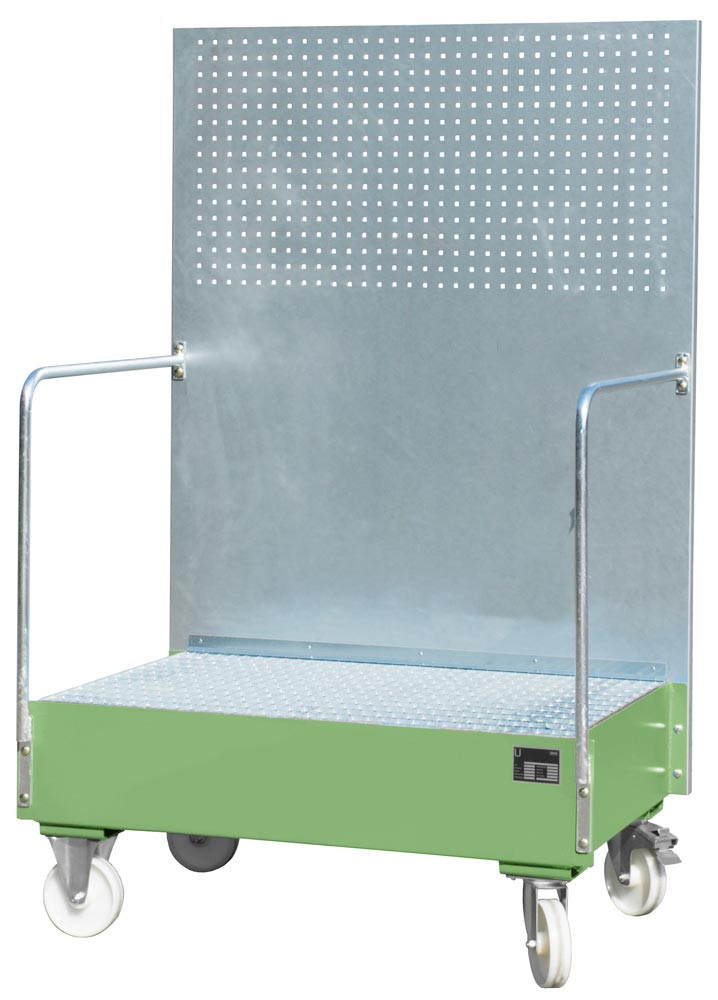 ∙ Mobiles, sicheres und einfaches Abfüllen von Ölen etc. an verschiedenen Verbrauchsstellen ∙ Auffangwanne aus 3 mm Stahlblech inkl. verzinktem, herausnehmbarem Gitterrost ∙ Traglast 1000 kg/m2 ∙ Stabile, verzinkte Stahlblechplatte mit Quadratlochung 10 x 10 mm, im fortlaufenden 38-mm-Raster für freie Positionierung von Werkzeughaltern ∙ Feuerverzinkte Schiebegriffe