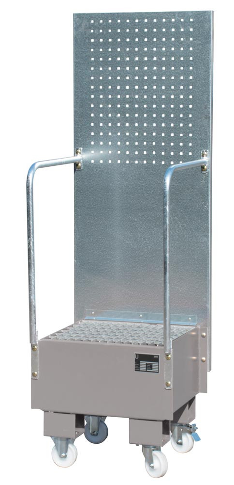 Auffangwanne mit Lochplatte, 3 mm Stahlblech, RAL 7005, fahrbar, für 1 St. 60-l-Fass, stehend Lagern, BxTxH 570x590x1775 mm, Auffangvol. 60 l
