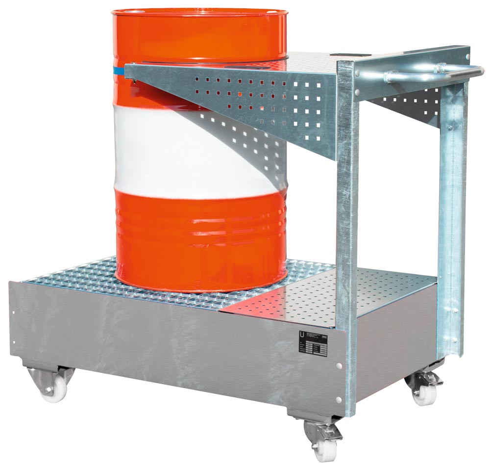 Auffangwanne mit Lochplatte, 3 mm Stahlblech, feuerverzinkt, fahrbar, für 1 St. 200-l-Fass, stehend Lagern, BxTxH 1450x800x1195 mm, Auffangvol. 215 l