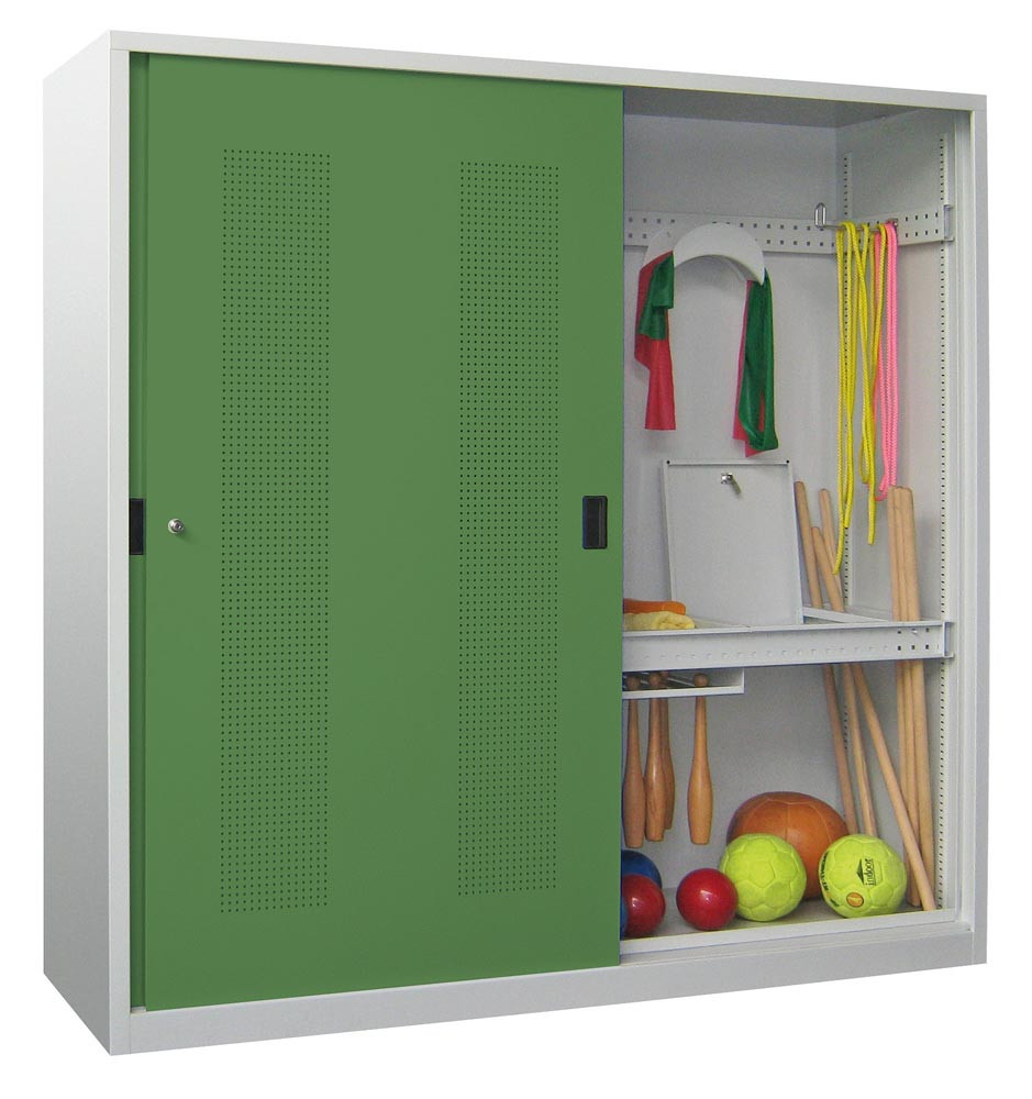 Ballschrank m. Lochblech Schiebetüren, BxTxH 2000x600x1950 mm, 4 Böden, 3 Längs- 4 Quertraversen, Wertfach, Schloss, RAL 7035/6011 E1987018
