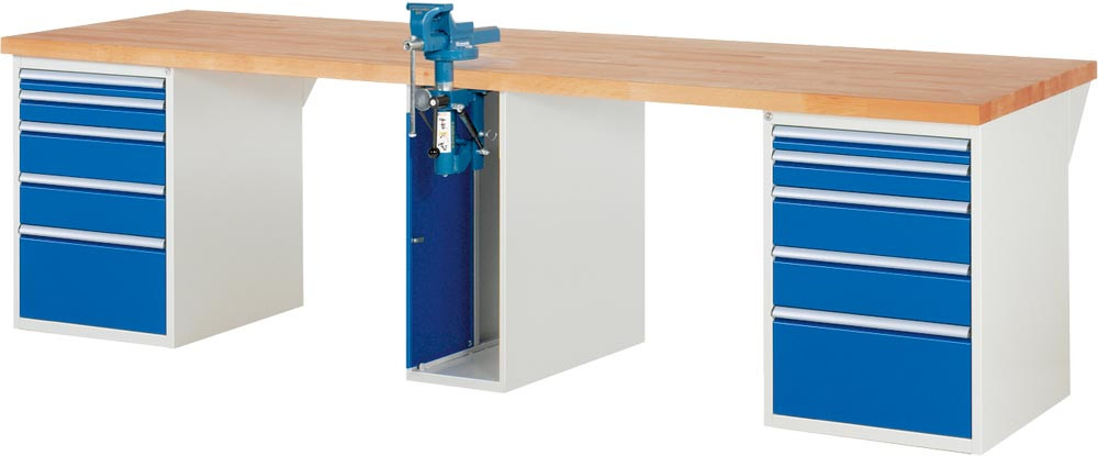 Baukastenwerkbank, BxTxH 2500x700x890 mm, Platte Buche , 2 Blocks, 1 Schraubstock, 10 Schubl. 2x60 mm, 2x90 mm, 4x150 mm, 2x270 mm, RAL 7035/5010 E6490606