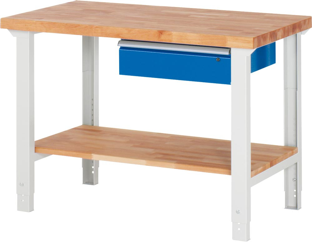Baukastenwerkbank, Platte Buche 40 mm, 1 Schublade 150 mm, 1 Ablageboden 545 mm, BxTxH 1250x700x790-1140 mm, RAL 7035/5010