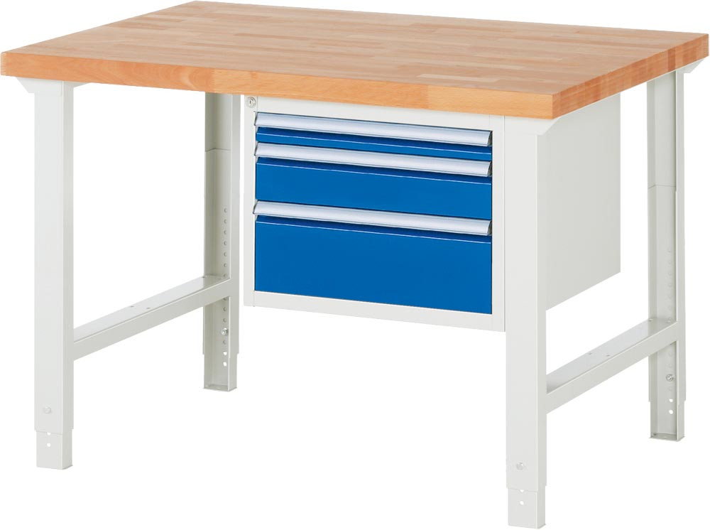 Baukastenwerkbank, Arbeitsplatte Buche massiv 40 mm 3 Schubladen 1x60 mm 1x120 mm 1x180 mm, BxTxH 1500x700x790-1140 mm, höhenverstellbar E847032