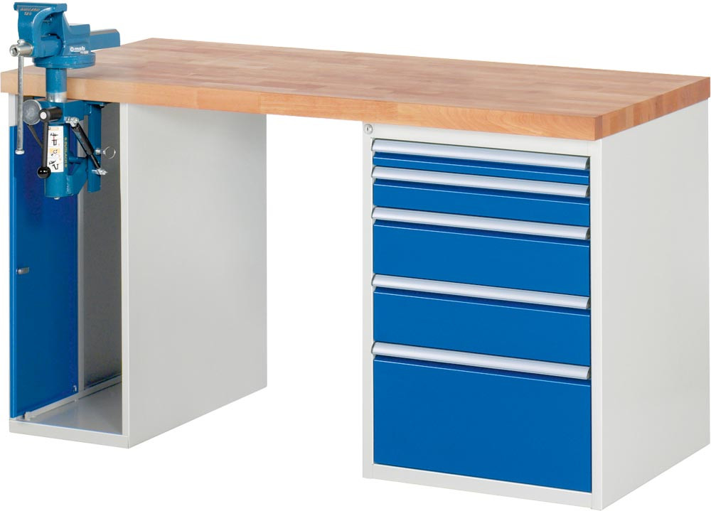 Baukastenwerkbank, Platte Buche 40 mm, 5 Schubladen: 60,90, 2x150, 270 mm, 1 Schrank. m. Schraubstock, BxTxH 1500x700x890 mm, RAL 7035/5010