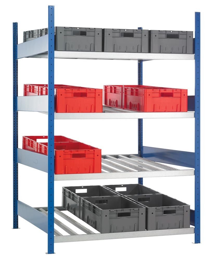 · Ideal für First-in-first-out-Lager, da Lagerware auf den Röllchenleisten nachrutschen kann ∙ Direkter Einblick und einfacher Zugriff durch Schrägstellung der Ebenen ∙ 4 Ebenen aus je 2 Quertraversen und 9 Röllchenleisten · Quertraversen dienen zur Aussteifung · Seitliche Begrenzung der Ebenen durch Tiefenriegel