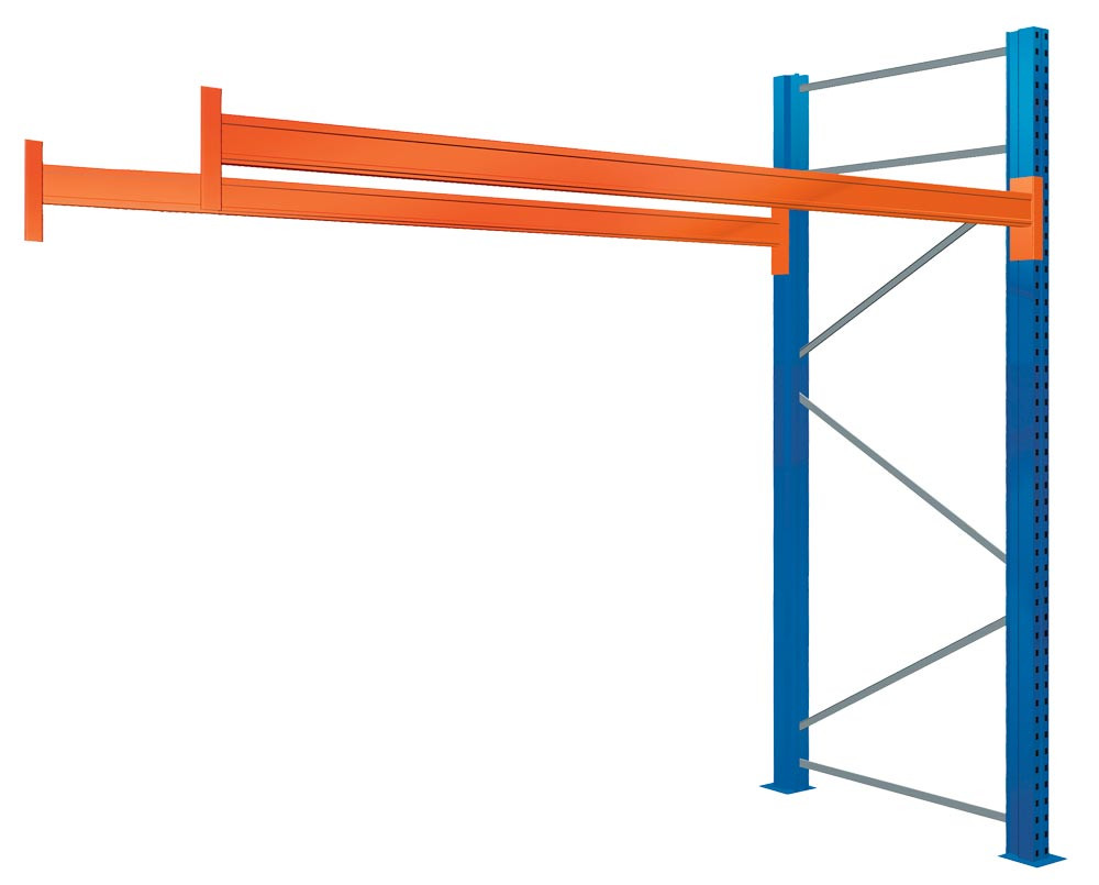 · Zur Lagerung von Paletten · Bock-Anbauregale dürfen ausschließlich in Kombination mit Bock-Grundregalen verwendet werden · 1 Holmebene · Rahmen blau, Holme orange, Fachwerk verzinkt