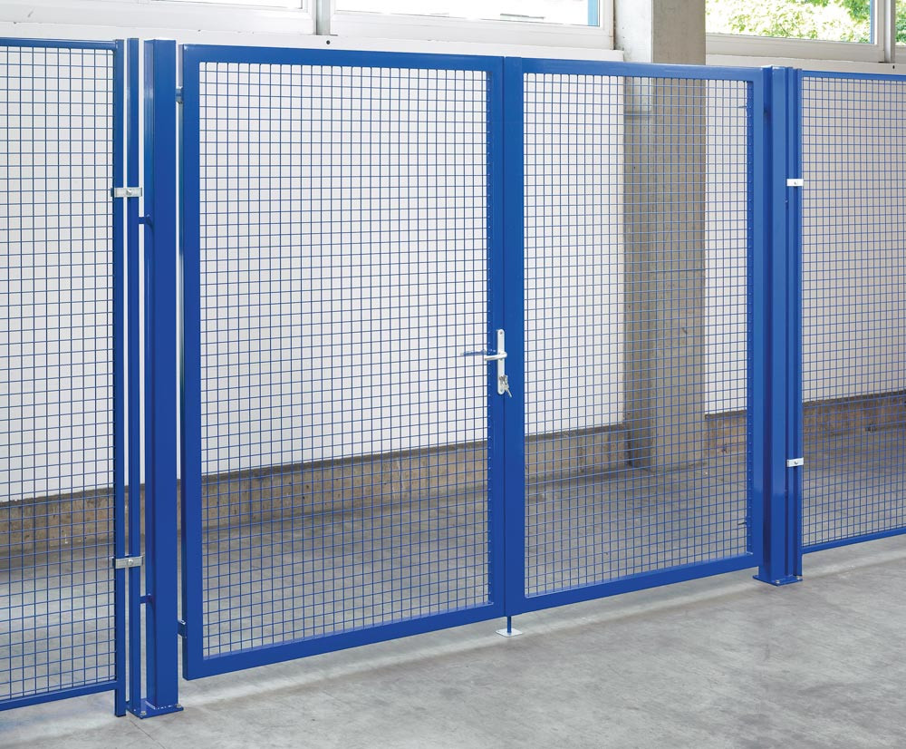 · Für den robusten Einsatzbereich, ohne obere Querstrebe · Flachgittermaschung 40 x 40 mm in Rahmenprofil 60/40 mm eingefasst · Direkt in das Trennwandsystem integrierbar · Komplett ausgestattet mit Torrahmenschloss und Drückergarnitur · Inkl. stabiler QR-Pfosten und verstellbarer Torbänder · Farbe RAL 7037 staubgrau