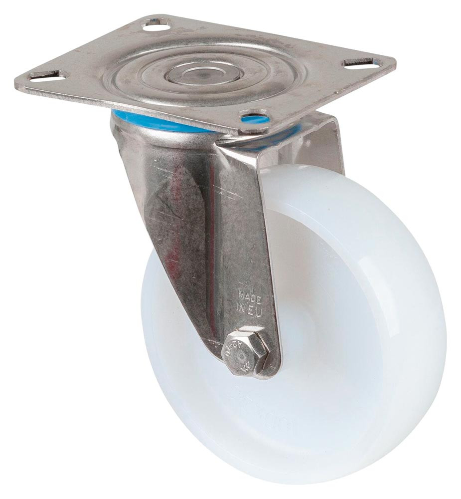 Edelstahl-Transportgeräte-Lenkrolle, Kunststoff weiß, Durchm. 100 mm, Traglast200 kg, Gleitlager, Anschraubplatte E6491011