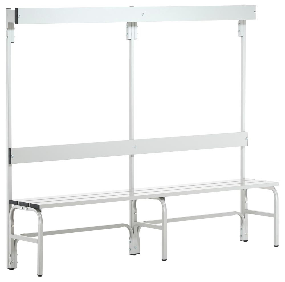 Massive Gestell-Konstruktion wahlweise aus Stahl- oder Edelstahlrohr · Gestell aus pulverbeschichteten Stahl- oder Edelstahl - Vierkant- und Rundrohr · Standardmäßig in RAL 7016 anthrazitgrau, die Edelstahlteile in RAL 7035 lichtgrau ·Sitzleisten, Rückenlehnen und Hakenleisten sind aus Aluminium und in RAL 7035 lichtgrau pulverbeschichtet · Haken- / Garderobenleisten mit verdeckt angebrachten Doppelkleiderhaken nach DIN 7917 · Sitzflächen sind vormontiert