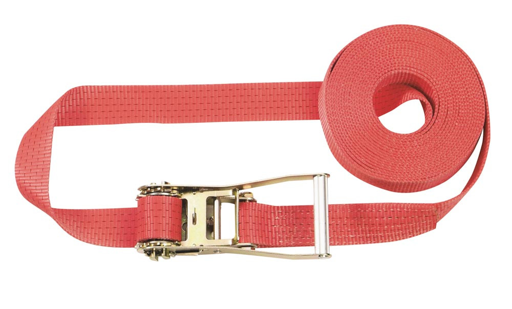 Einteiliger Zurrgurt, 5000 daN zul. Zugkraft in der Umreifung, Gurtbreite 50 mm, Länge 4 m, Farbe rot, 5 Streifen, VE 2 Stück