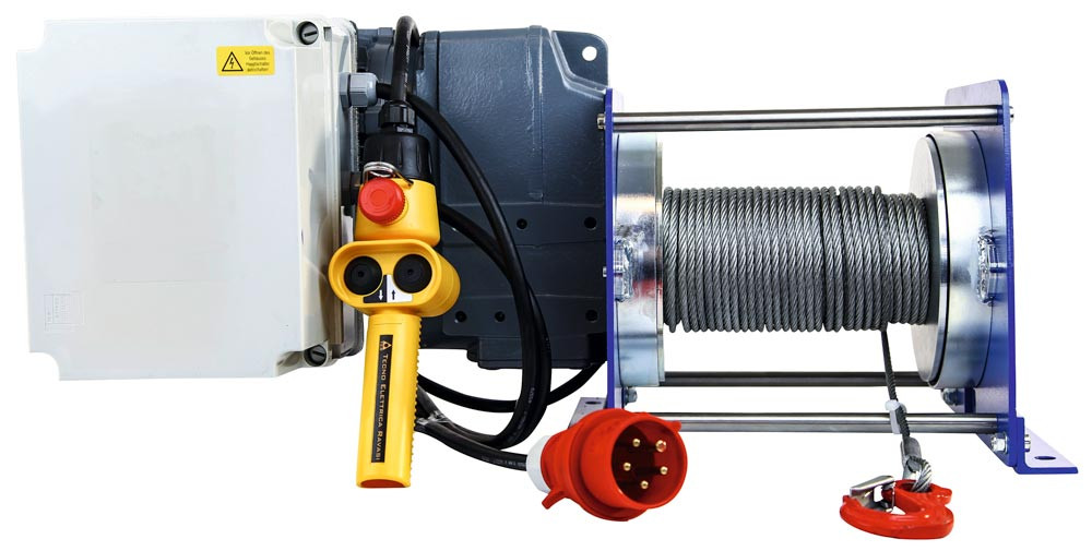 ∙ Hocheffizientes Stirnradgetriebe mit Drehstrombremsmotor ∙ Gerillte Seiltrommel ∙ Inkl. 50 m Hubseil ∙ Sicherheitssteuerung mit Niederspannungsschaltkreis und separater Ansteuerung der Bremse ∙ Betriebsendschalter zum freien Festlegen der Abschaltpositionen ∙ Handsteuertaster an 3 m Steuerleitung ∙ Netzstecker an 3 m Zuleitung ∙ Dokumentation, Prüfbuch und EG-Einbauerklärung