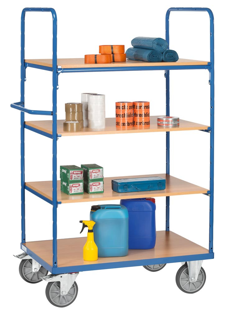 · 2 offene Stirnwände · Der unterste Boden ist fest, die restlichen Böden höhenverstellbar · Schweißkonstruktion aus Stahlrohr und Profilstahl · pulverbeschichtet · Schlag- und kratzfest · Böden Holzwerkstoffplatte mit Buchendekor, höhenverstellbar im 100-mm-Raster · 2 Lenk- und 2 Bockrollen · Lenkrollen gemäß EN 1757-3 mit Rad-Feststeller · TPE-Bereifung (thermoplastisches Elastomer) ∙ Naben mit Rillenkugellager