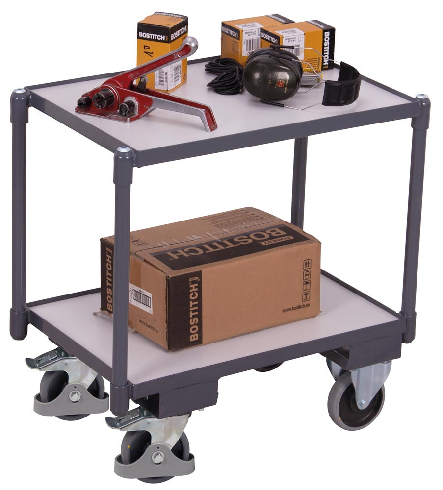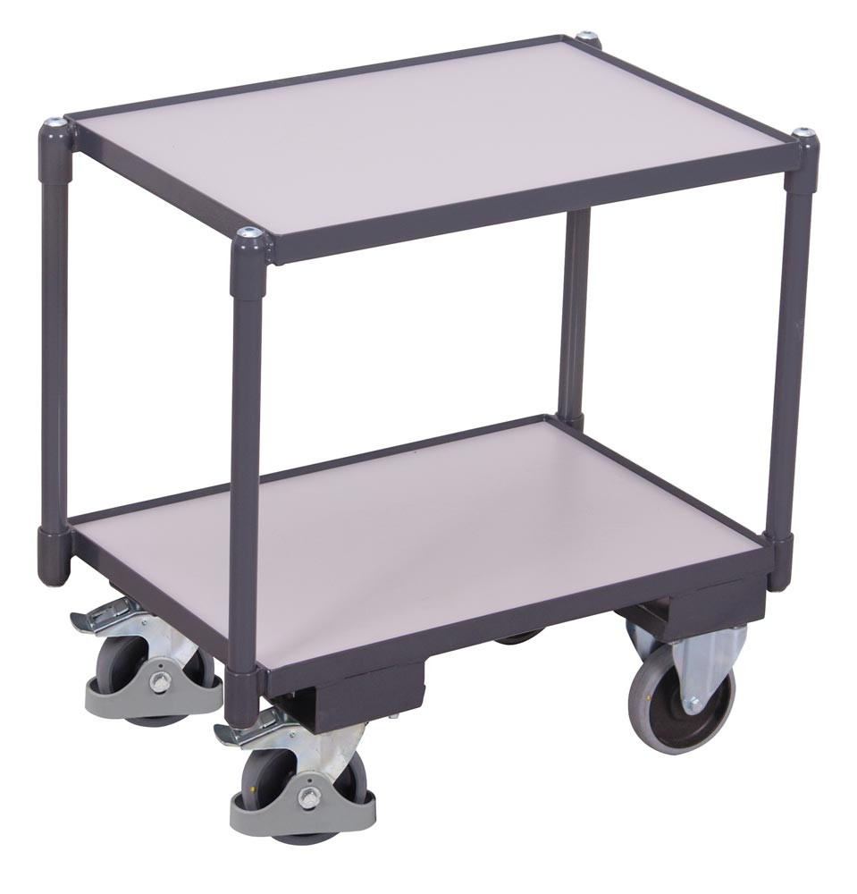 ∙ Elektrisch leitfähige Ausführung (ESD = Electric Static Discharge) ∙ Stahlrohr und Profilstahl geschweißt bzw. in Schraub-Steckkonstruktion ∙ Elektrisch leitfähig pulverbeschichtet in RAL 7024 graphitgrau ∙ Schlag- und kratzfest ∙ Böden aus elektrisch leitfähigen Dekorspanplatten in lichtgrau ∙ 2 Lenk- und 2 Bockrollen ∙ Lenkrollen gemäß EN 1757-3 mit Rad-Feststeller und Fußschutz ∙ Elektrisch leitfähige Vollgummi-Bereifung ∙ Naben mit Kugellager und Fadenschutz