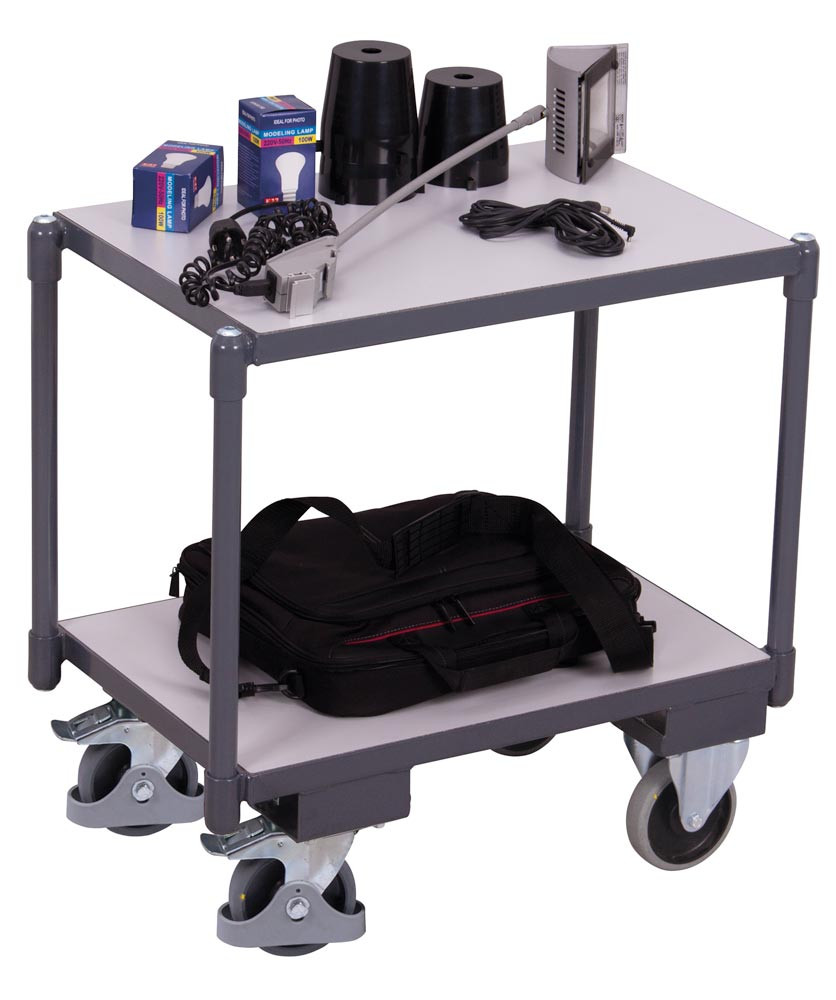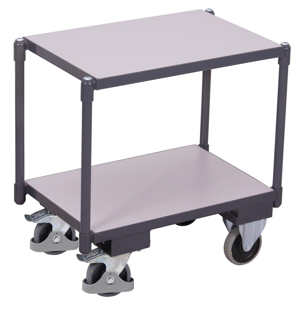 ∙ Elektrisch leitfähige Ausführung (ESD = Electric Static Discharge) ∙ Stahlrohr und Profilstahl geschweißt bzw. in Schraub-Steckkonstruktion ∙ Elektrisch leitfähig pulverbeschichtet in RAL 7024 graphitgrau ∙ Schlag- und kratzfest ∙ Böden aus elektrisch leitfähigen Dekorspanplatten in lichtgrau ∙ 2 Lenk- und 2 Bockrollen ∙ Lenkrollen gemäß EN 1757-3 mit Rad-Feststeller und Fußschutz ∙ Elektrisch leitfähige Vollgummi-Bereifung ∙ Naben mit Kugellager und Fadenschutz