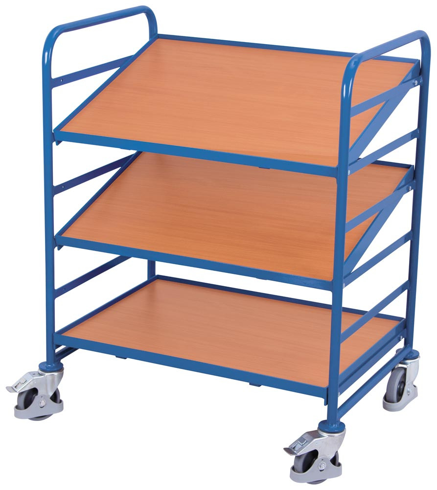 · Stahlrohr- und Winkelstahlkonstruktion · RAL 5010 enzianblau pulverbeschichtet · Schlag- und kratzfest · Neigung der Ladeflächen bei schrägem Einbau bis 15° und 30° · 4 Lenkrollen, 2 davon gemäß EN 1757-3 mit Rad-Feststeller und Fußschutz · Thermoplastische Vollgummi-Bereifung, grau "spurlos" · Naben mit Präzisions-Rillenkugellager und Fadenschutz