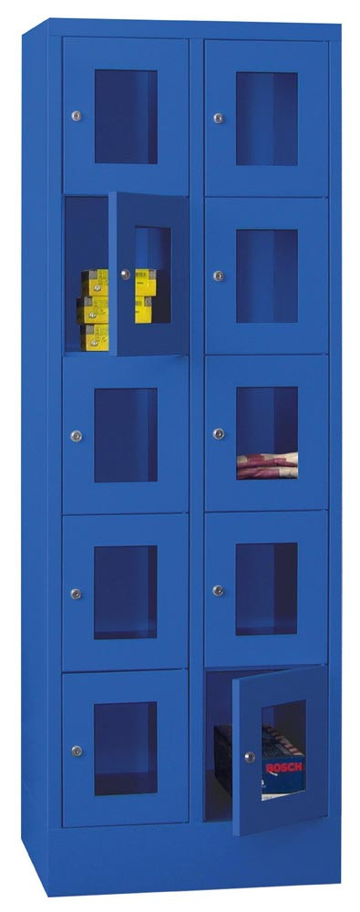 Fächerschränke mit Sichtfenstertüren, 2x5 Fächer, Schloss, BxTxH 600x500x1850 mm, Abt. B 300 mm, RAL 5010