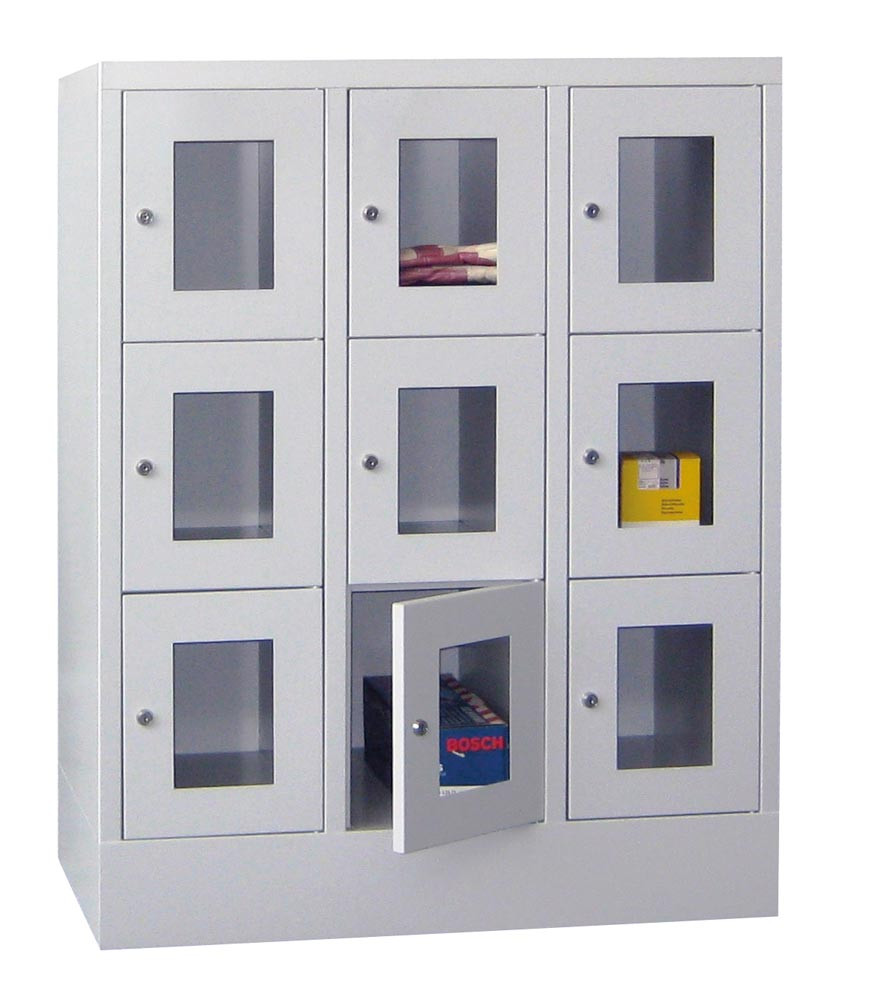 Fächerschränke mit Sichtfenstertüren, 3x3 Fächer, Schloss, BxTxH 900x500x1187 mm, Abt. B 300 mm, RAL 7035