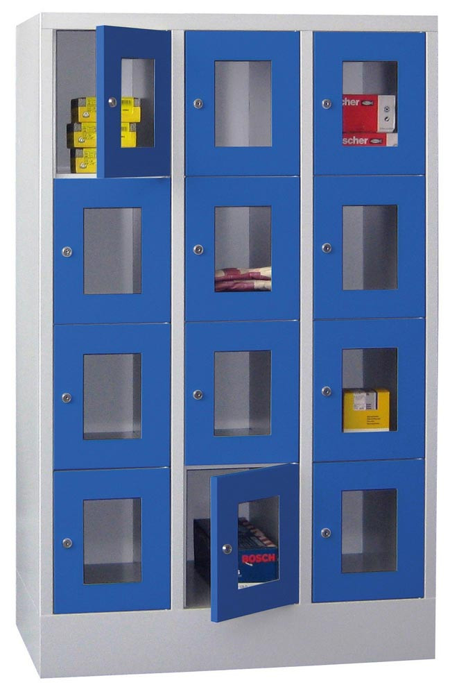 Fächerschränke mit Sichtfenstertüren, 3x4 Fächer, Schloss, BxTxH 900x500x1518 mm, Abt. B 300 mm, RAL 7035/5010
