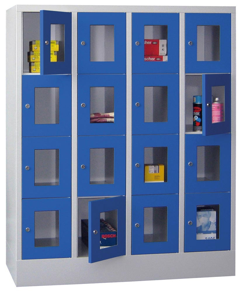 Fächerschränke mit Sichtfenstertüren, 4x4 Fächer, Schloss, BxTxH 1200x500x1518 mm, Abt. B 300 mm, RAL 7035/5010