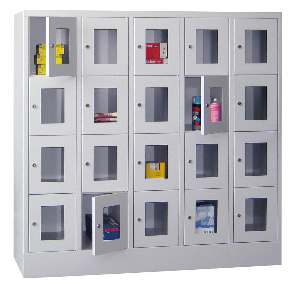Fächerschränke mit Sichtfenstertüren, 4x5 Fächer, Schloss, BxTxH 1200x500x1850 mm, Abt. B 300 mm, RAL 7035