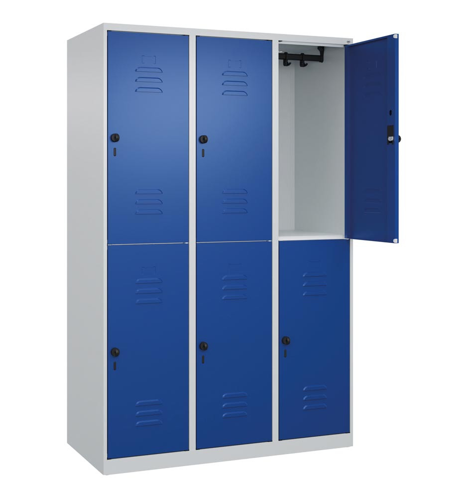 Fächerschrank, doppelstöckig, BxTxH 1200x500x1850 mm, 3x2 Fächer, Abt.B 400 mm, Drehriegel, bodenstehend, RAL 7035/5010