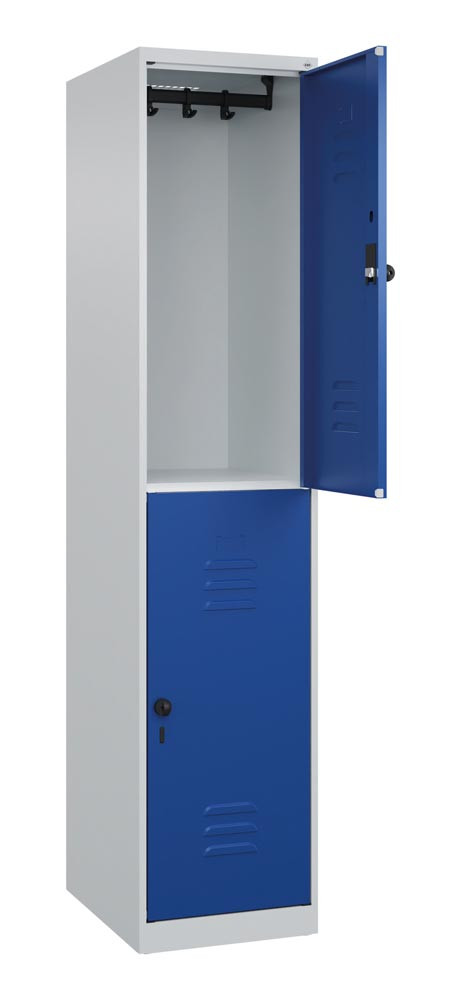 Fächerschrank, doppelstöckig, BxTxH 300x500x1850 mm, 1x2 Fächer, Abt.B 300 mm, Drehriegel, bodenstehend, RAL 7035/5010 E6476650