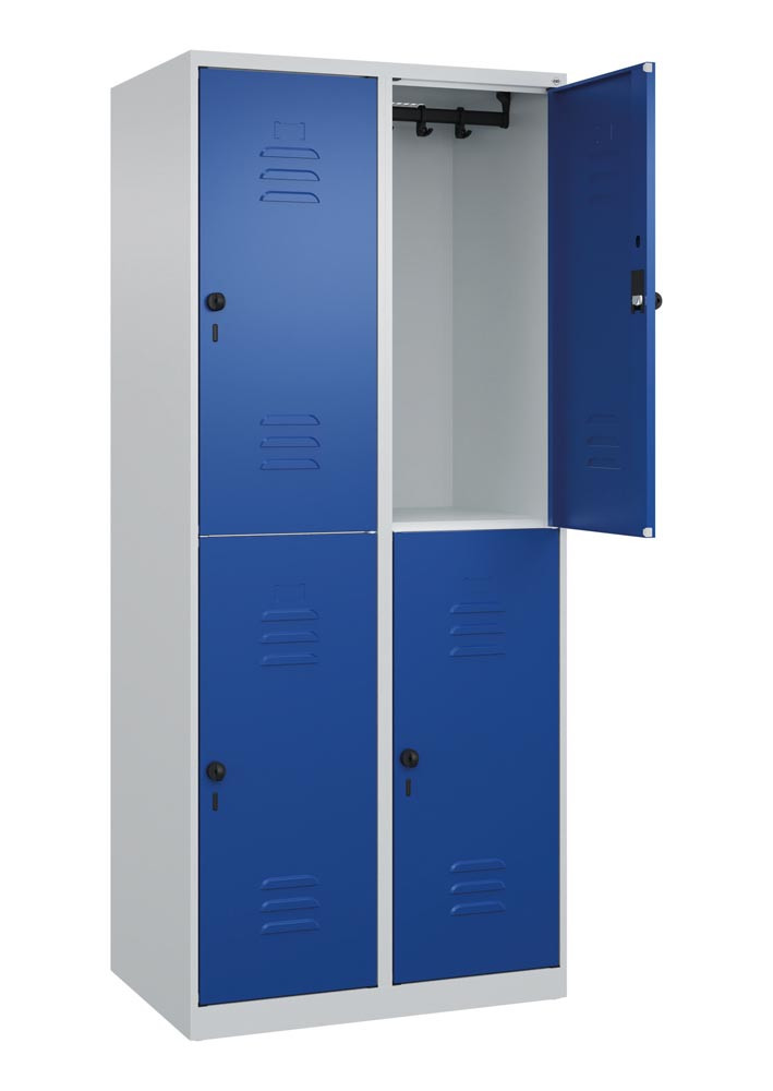 Fächerschrank, doppelstöckig, BxTxH 800x500x1850 mm, 2x2 Fächer, Abt.B 400 mm, Drehriegel, bodenstehend, RAL 7035/5010