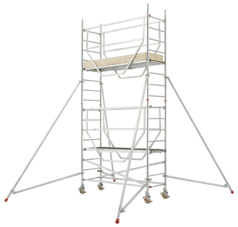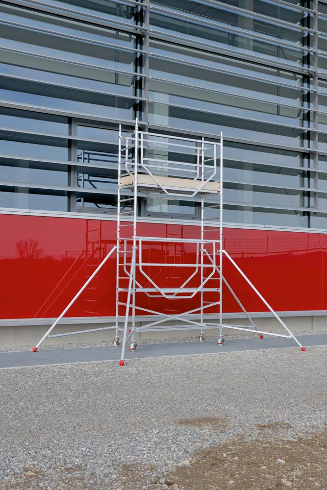 ∙ Äußerst stabile und innovative Konstruktion ∙ Weniger Gerüstteile durch kompakte Bauform ∙ Dadurch sehr einfacher und schneller Auf- und Abbau ∙ Ohne Hilfswerkzeuge mittels Steckverbinder und Schnellverschlüssen problemlos montierbar ∙ Ultraleichte Bauelemente und geringe Außenmaße ermöglichen den Transport in beinahe jedem Nutzfahrzeug (Kombi/Transporter) ∙ Geschweißte Ausführung ∙ Ideal für Arbeiten im Rohbau und unebenen Untergründen ∙ Höhenverstellbare Lenkrollen Ø 150 mm