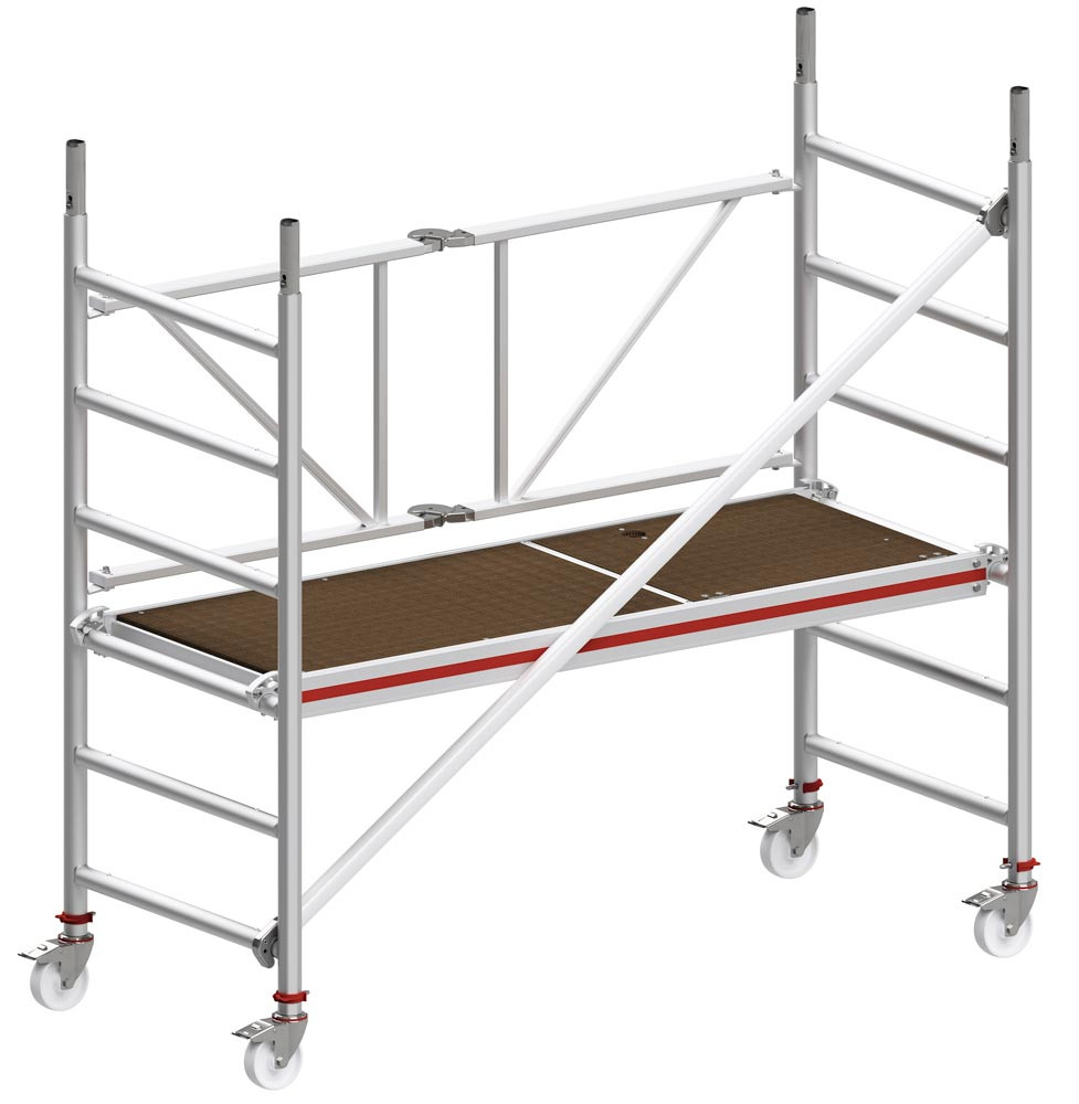 ∙ Kompakt und Platzsparend ∙ Äußerst stabil ∙ Mit großer Arbeitsbühne L x B 1900 x 650 mm ∙ Aufbau optional mit Höhenversatz z. B. in Treppenstellung ab Größe ∙ Zulässige Belastung 200 kg/m2 ∙ 4 Lenkrollen Ø 125 mm (ab Größe Ø 150 mm) ∙ Nach EN 1004