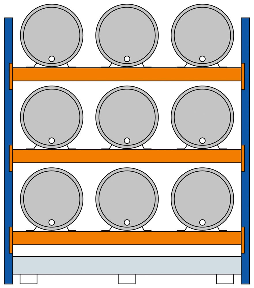 ∙ Rahmen aus Stahl, blau kunststoffbeschichtet ∙ Verstrebungen aus Stahl, verzinkt ∙ Holme aus Stahl, orange kunststoffbeschichtet ∙ Auffangwannen und Fassauflagen verzinkt ∙ Sonderausführungen wie z. B. Fass-Freilagerregale komplett mit Dach, sind auf Anfrage lieferbar ∙ Belastung pro Ebene bis 2300 kg (bei gleichmäßig verteilter Last)