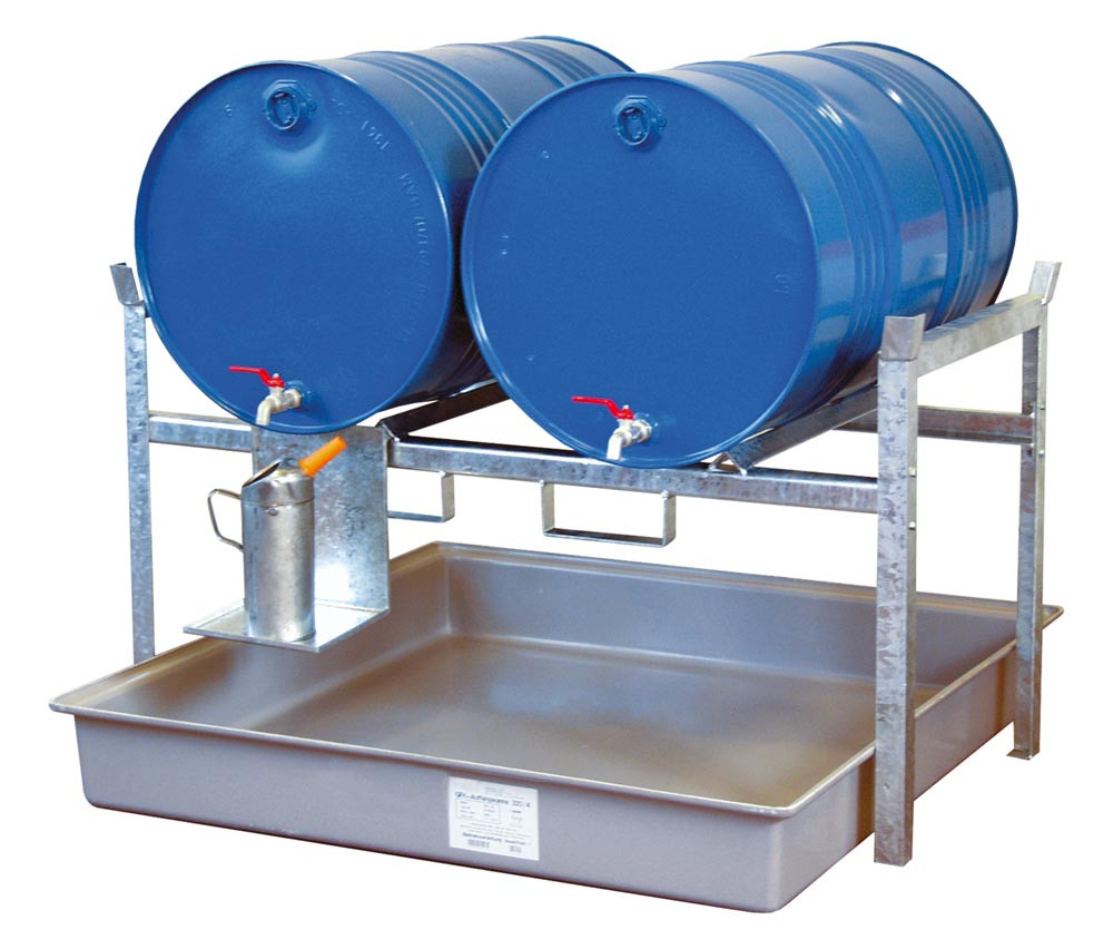 Fassregal, Stahl verzinkt, mit Fassauflage für 2x60-l-Fässer oder 1x200-l-Fass, GFK-Auffangwanne Auffangvolumen 220 l, BxTxH 990x1280x840 mm E812120