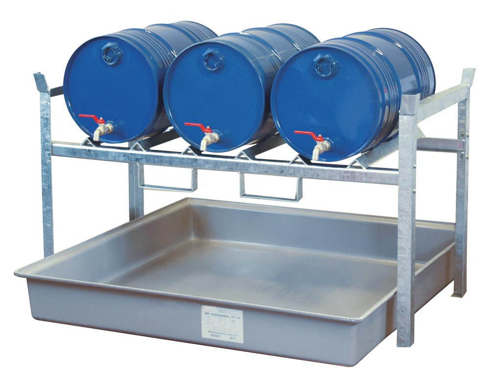 Fassregal, Stahl verzinkt, mit Fassauflage für 3x60-l-Fässer, GFK-Auffangwanne Auffangvolumen 220 l, BxTxH 1410x1280x840 mm