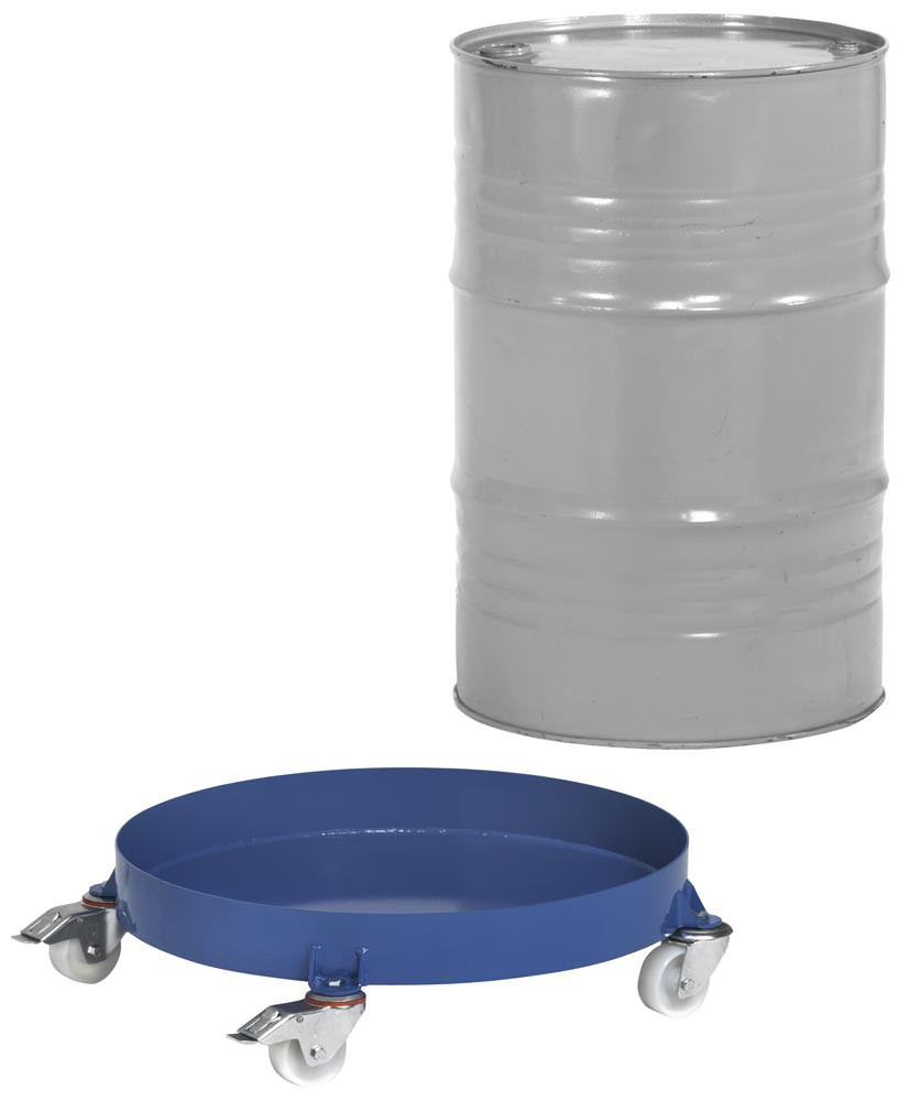 ∙ Für den Transport von stehenden 60- und 200-l-Fässern ∙ Geschweißte Stahlkonstruktion ∙ RAL 5007 brillantblau pulverbeschichtet ∙ Schlag- und kratzfest ∙ 4 Polyamid-Lenkrollen, 2 davon mit Feststeller ∙ Naben mit Gleitlager